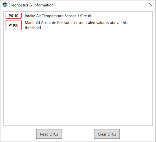 The Diagnostics & Information window can be used to view and clear Diagnostic Trouble Codes (DTCs).